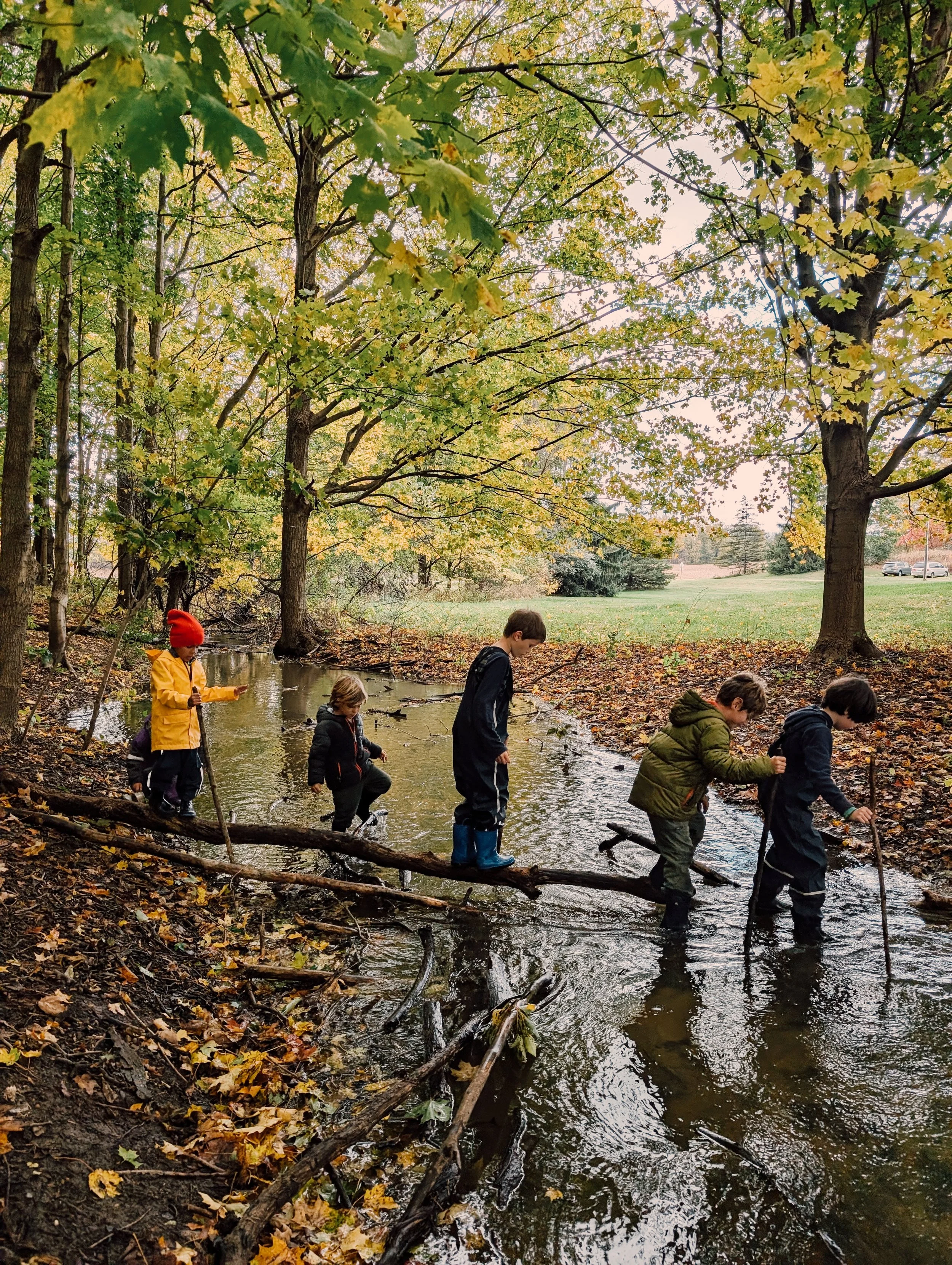 Students take to the woods (Or the meadow! The pond! The creek!) to create play schemes of their own. All are free to play, explore and invent. While Mother Nature provides most all that we need, we do add open-ended pieces and loose parts - think rope swings, fort-building materials, and mud kitchens!